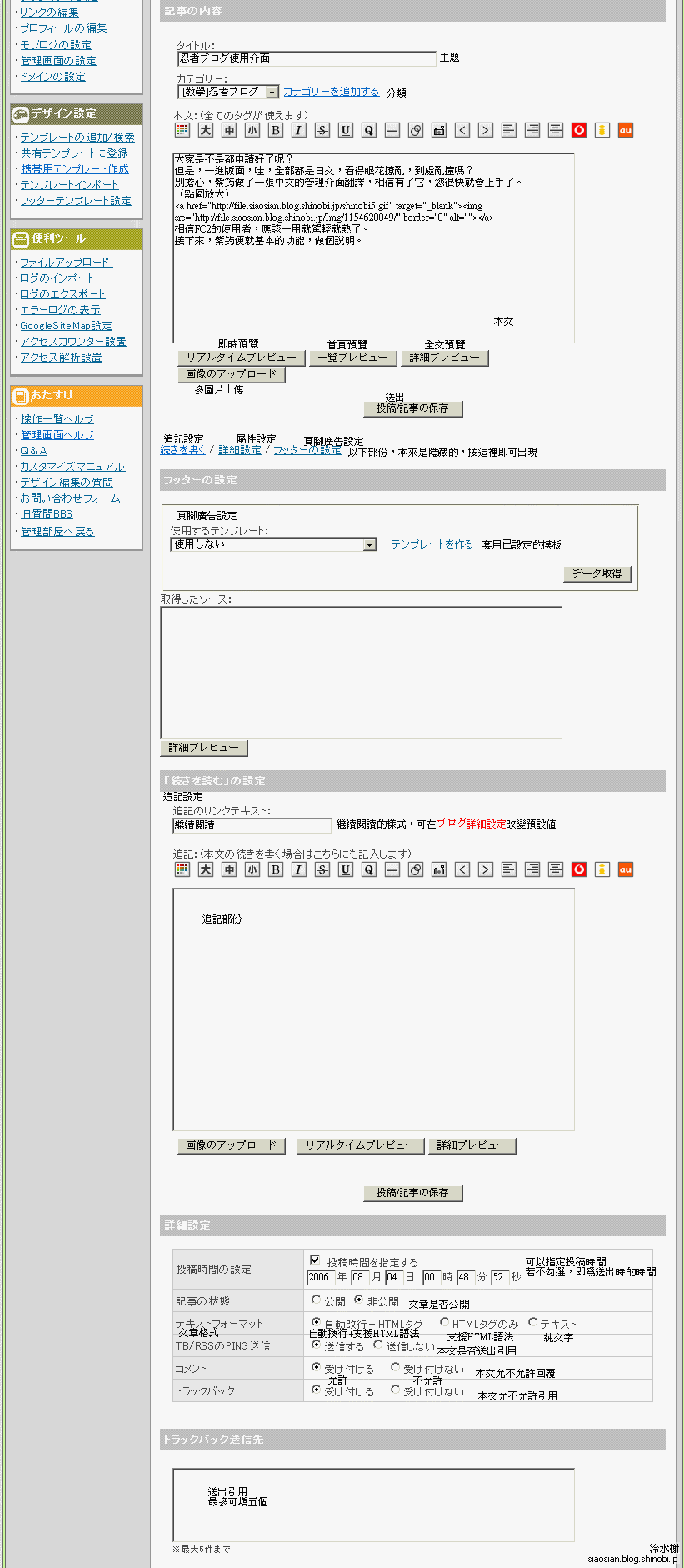 忍者ブログ的管理介面排版跟FC2不太一樣,但功能可以說是大同小異,我甚至懷疑他們是不是使用同一個系統!?